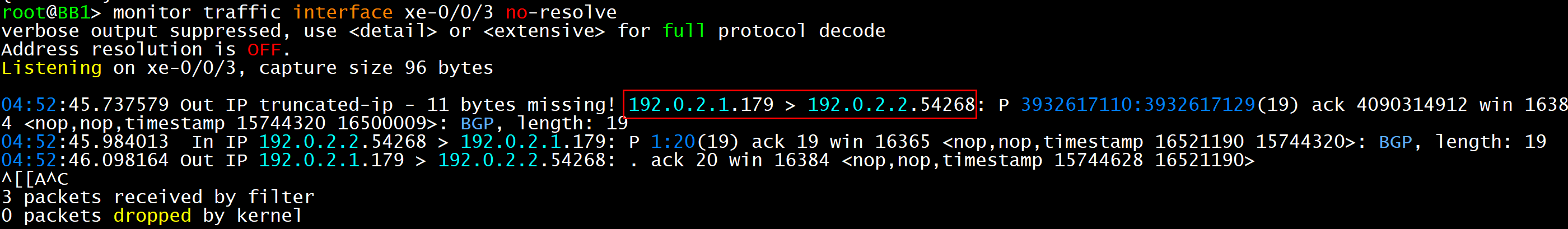 monitor traffic interface xe-0/0/3 no-resolve