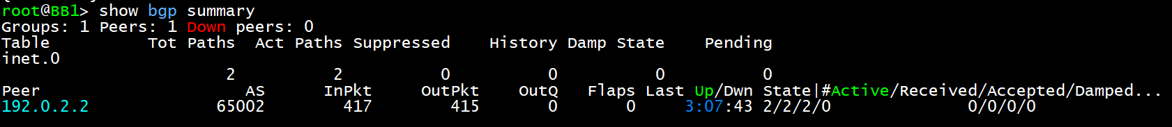 - BB2에서 BGP Session을 맺은 이웃에게 광고하고 있는 대역을 확인할 수 있다. 위의 설정이 올바르게 동작하고 있다.