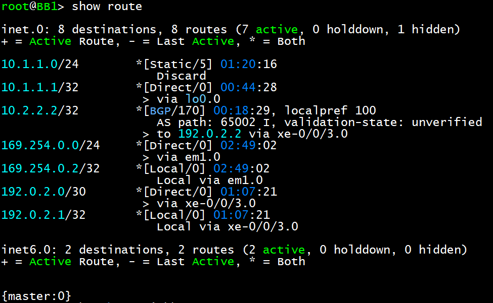 - BB2에서 lo0를 추가 생성하고 해당 IP를 광고한다. 이후 BB1에서 광고대역을 확인한다. 한 개의 대역이 추가되어 다음으로 넘어간다.
