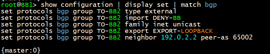 set protocols bgp group TO-BB1 export EXPORT-LOOPBACK