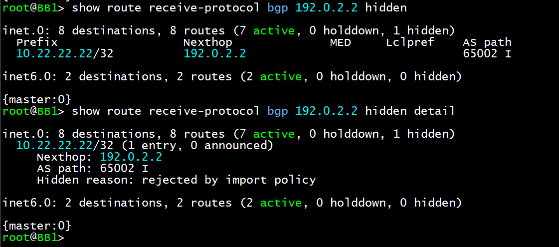 - BB2는 10.2.2.2/32와 10.22.22.22/32 를 광고하고 있다. 이때, BB1는 이 모든 것을 받을 수도 있지만 Import 정책을 통하여, 받고 싶은 IP 대역만 받을 수 있다. BB1에서 10.2.2.2/32만 받고(accept) 나머지는 차단(reject)하는 policy를 세운 뒤, BGP 설정에서 import에 이 정책을 지정한다.